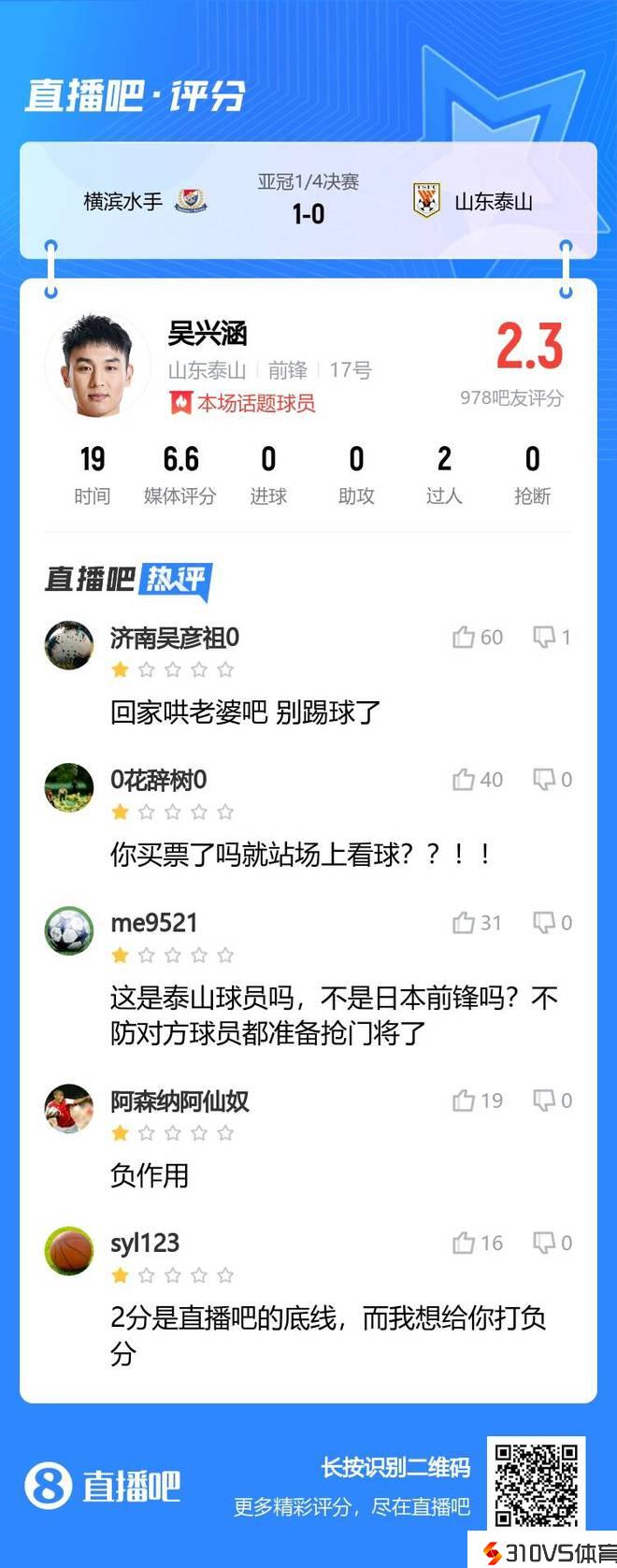 第71分钟退场的吴兴涵灾难发扬,漏人致丢球,同时屡次目送对手。赛后吧友给吴兴涵打出2.3分的低分。