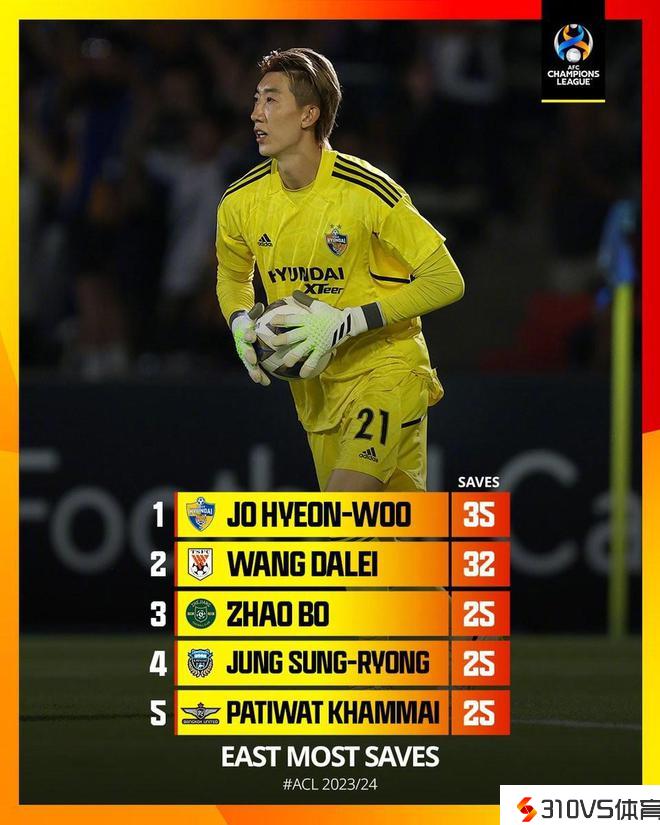 亚冠东亚区扑救榜:赵贤祐35次居榜首,王大雷第二,赵博第三