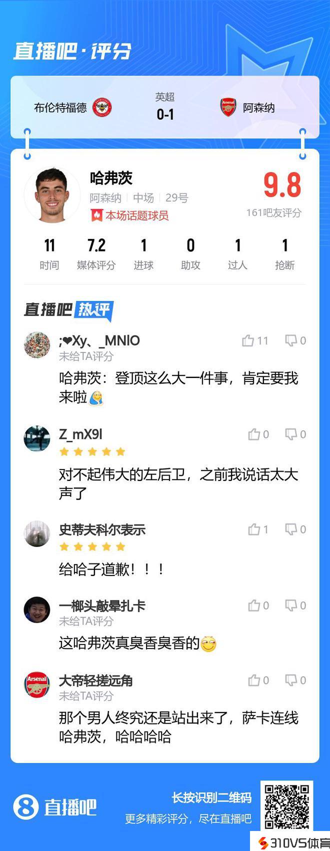 哈弗茨评分9.8吧友:给伟大的左后卫抱歉,之前我说话太大声