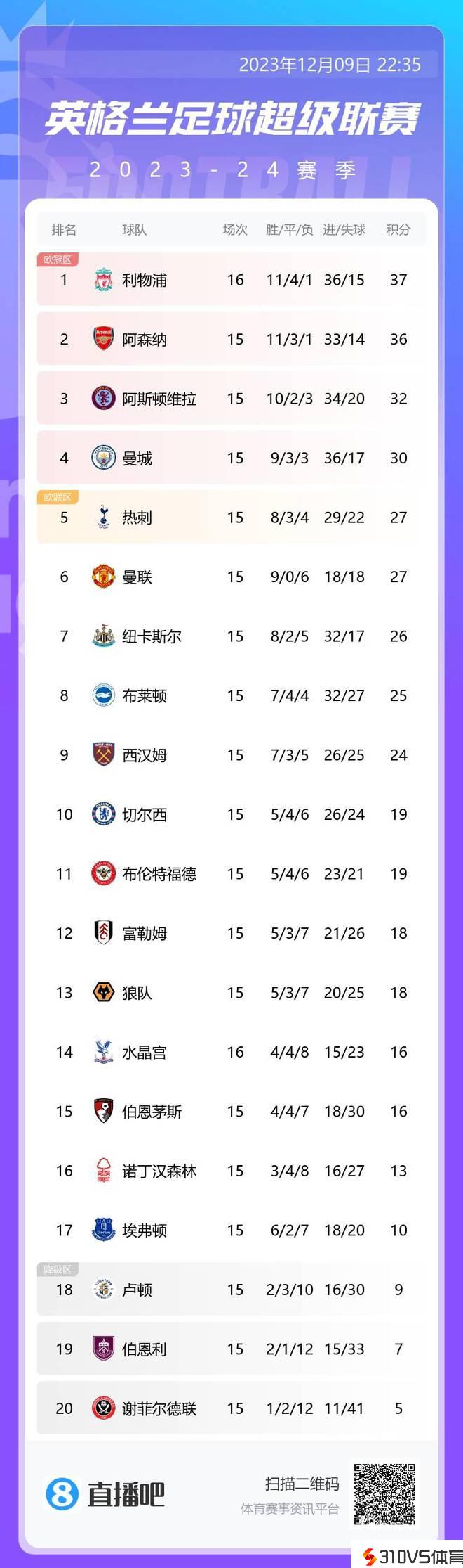 英超积分榜:红军三连胜先赛登顶,二三名枪手维拉迎直接对话