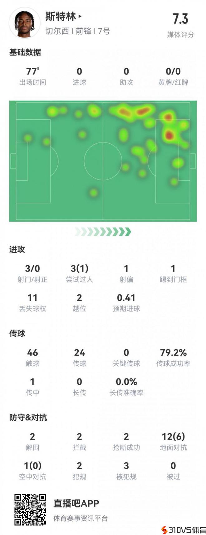 斯特林本场数据:1次造点,3射0正1中柱,1次失良机,评分7.3分