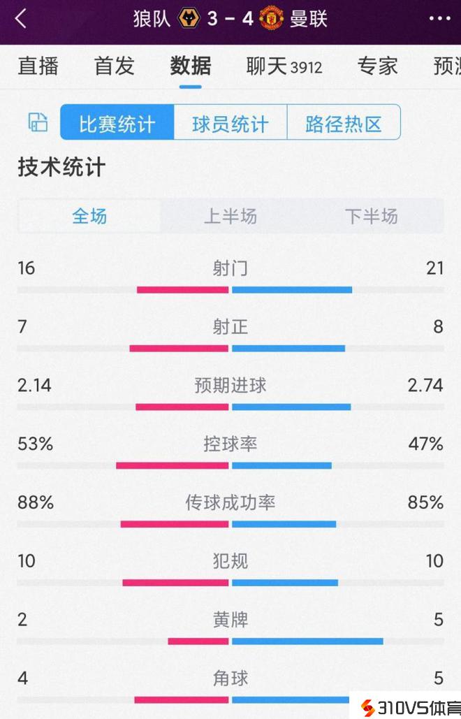 惊险抚慰!曼联4-3狼队全场数据:射门21-16,射正8-7