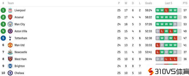 25轮事先,利物浦57分在积分榜上居首,阿森纳55分排在第二,而少赛一场的则是53分排在第三位。三支队伍之间,每一个名次之间只差2分,可谓异常的胶着。