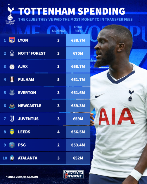 媒体还盘点了近20年来,热刺主要的“供货方”。法甲里昂队以8870万欧元排名第一,诺丁汉森林以7000万排名第二,阿贾克斯以6870万排在第三。之后是富勒姆(6170万)、埃弗顿(6160万)、纽卡斯尔(5930万)、尤文图斯(5900万)、利兹联(5650万)、巴黎圣日耳曼(5340万)和亚特兰大(5200万)。