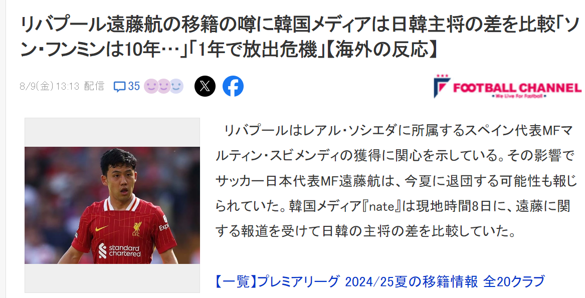 韩国媒体《Nate》则是幸灾乐祸,在介绍远藤航的标题里写着“孙兴慜在英超强队十年来一直是绝对主角”,并进行评论指出:“远藤航很可能被利物浦清洗,这消息再次证明了孙兴慜是多么伟大的球员。韩国队长在英超强队里多年来一直扮演着重要作用,而日本国家队的队长很可能在效力利物浦一年后就被扫地出门。”