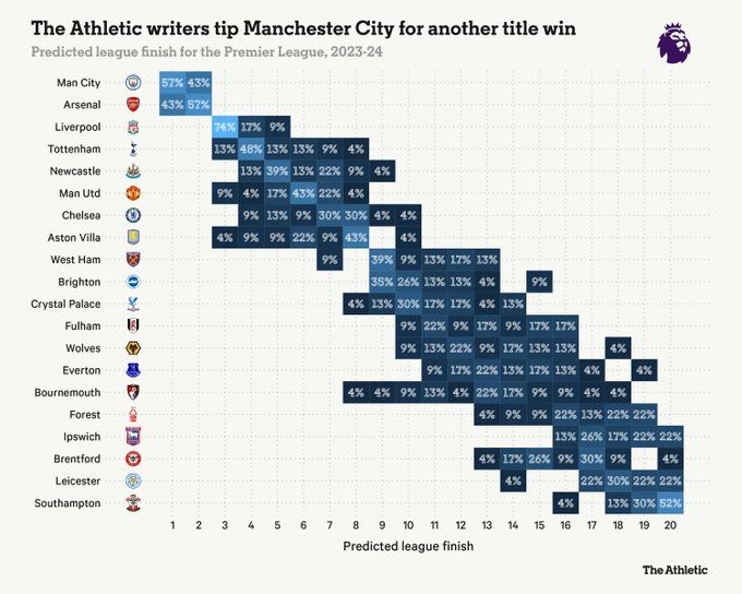 在《TA》的预测中,新赛季依旧只有两支球队争冠,利物浦、热刺、纽卡斯尔联、曼联、切尔西、阿斯顿维拉将继续在新赛季争夺英超第三和第四的席位。