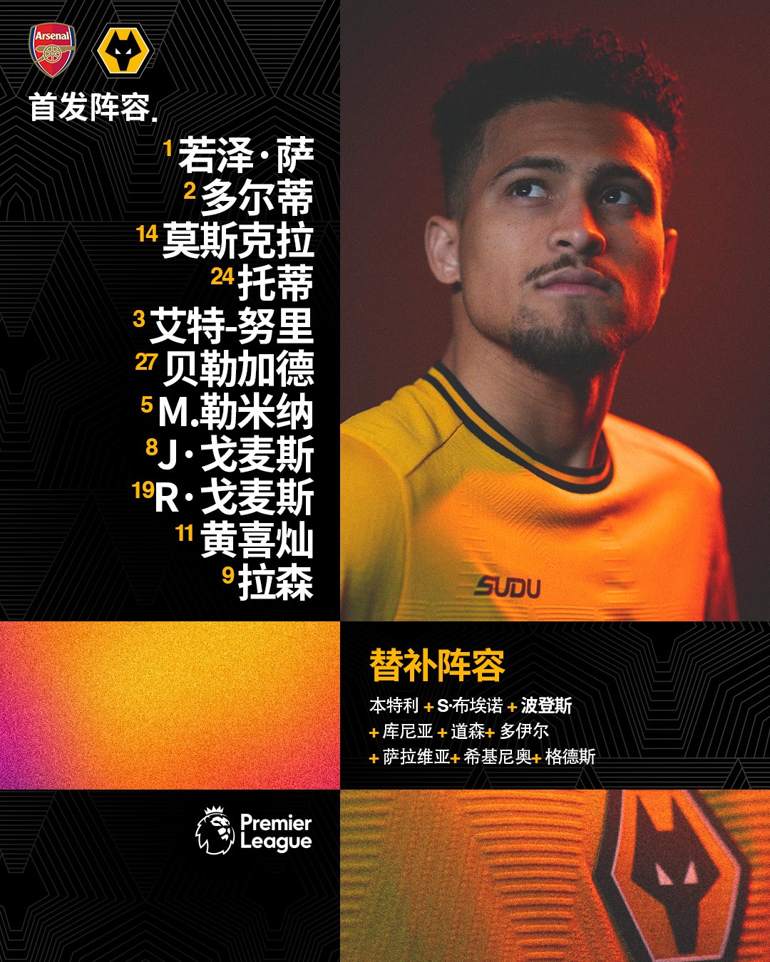 阿森纳VS狼队首发:黄喜灿出战