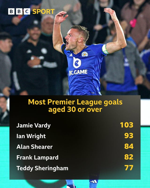 根据数据统计,瓦尔迪在30岁后已经打进103粒英超进球,在30岁后英超进球数的球员中遥遥领先。