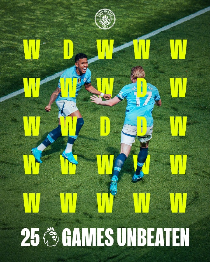 【一图流】一个字:稳!曼城完成英超跨赛季25轮不败