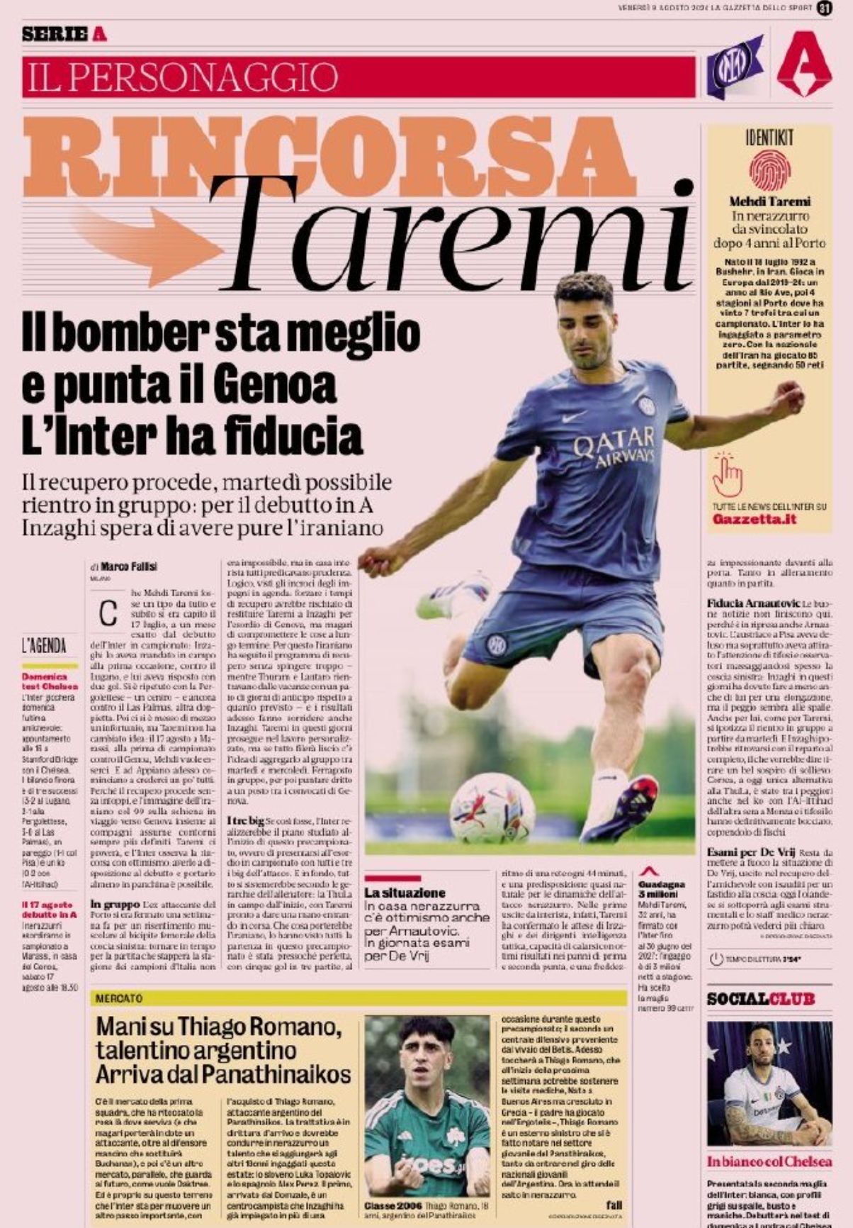 伊朗前锋塔雷米今夏从葡超波尔图队自由转会国际米兰,他也成为蓝黑军夏训一系列热身赛里状态最杰出的球员,他前3场热身赛打入5球并有助攻。上周,塔雷米因为肌肉伤势而缺席训练,最初的预测是他将缺席3周左右,将肯定缺席意甲首轮,可能缺席第二轮。不过最新的检测结果显示,他的伤情恢复良好,下周二就能恢复训练,并在意甲开始前恢复到最佳状态。