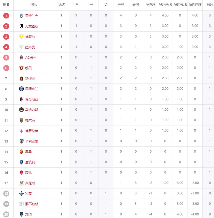 上赛季另外两支前四的球队,亚特兰大以及尤文图斯则是先后取得大胜。亚特兰大客场4-0莱切暂列积分榜榜首,尤文图斯主场3-0大胜科莫暂列第二。