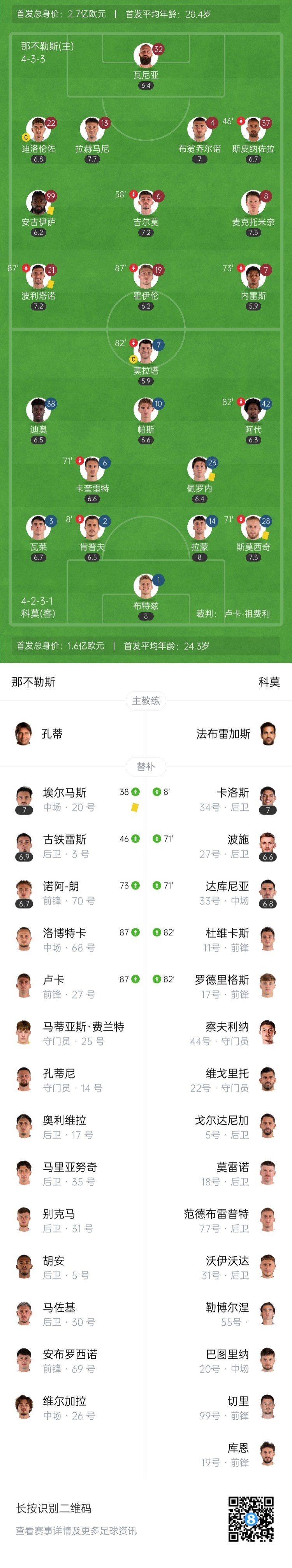 无缘3连胜!那不勒斯0-0闷平科莫 莫拉塔造点+失点 吉尔莫伤退