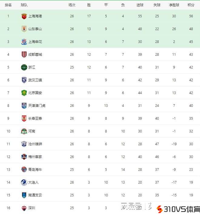 中超最新积分榜:上海海港输球8分领跑,山东泰山客平终结4连胜!