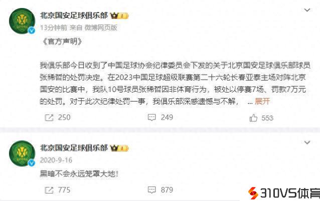 黑暗再次掩盖大地?国安3年前曾发相似文案,抗议中超联赛判罚