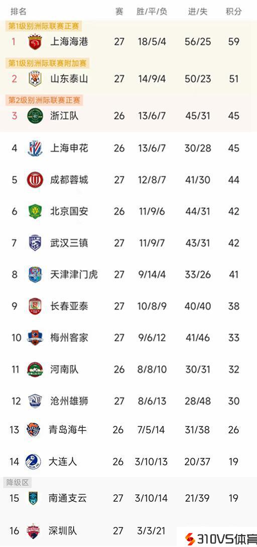 中超最新积分榜