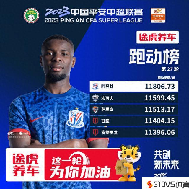 中超第27轮跑动榜:阿马杜居首,朱可夫第二萨里奇第三