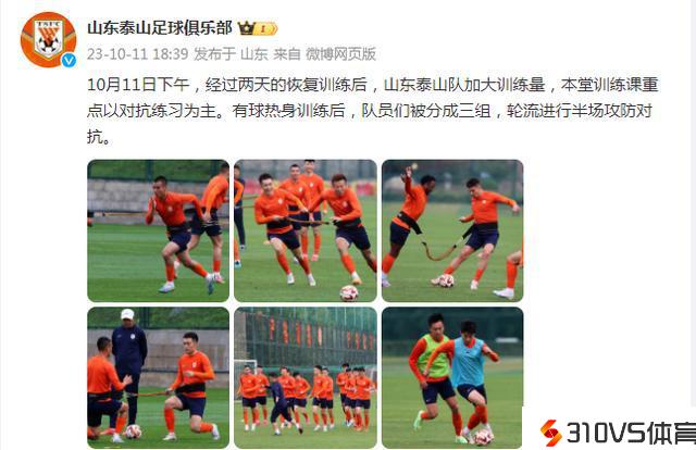 在10月11日早晨18:39分,泰山队官方宣布了球队最新静态。此次主帅崔康熙也自动调整训练布置,两大主力回归,两人列席训练。在官方发文表示,经过两天的恢复训练之后,球队也加大了训练量。本次训练课重点以对立训练为主,有球热身训练之后,队员们被分红三组,轮番停止半场的攻防对立。
