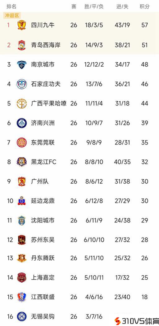 中甲最新积分榜:九牛最快下轮冲超,广西6轮不胜,石家庄4连平