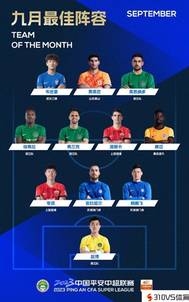 中超9月最佳阵容:韦世豪、费莱尼领衔,浙江4人中选