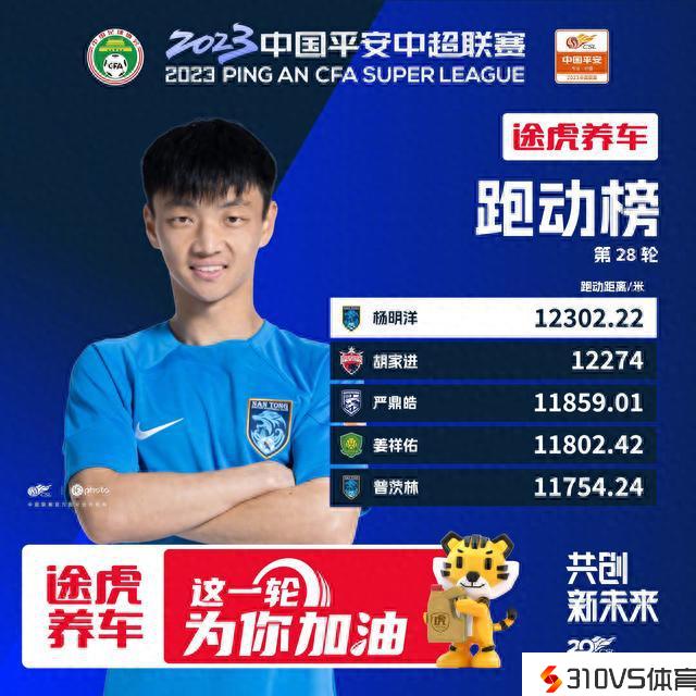 中超第28轮跑动榜:杨明洋12302米登顶,胡家进第二