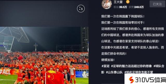 此役泰山队获胜,主帅崔康熙功不可没,他的排兵布阵是取胜关键,此外王大雷力保球门不失,外援费莱尼、克雷桑更是形状正佳,全队的拼搏肉体是取胜的关键。赛后王大雷在社媒真情流露并晒出合影,他表示第一次在韩国赢下韩国球队,第一次在韩国客场零封对手,感谢球迷,在迷雾中光就是希望,希望不是他人施舍的,而是我们拼命寻觅的!