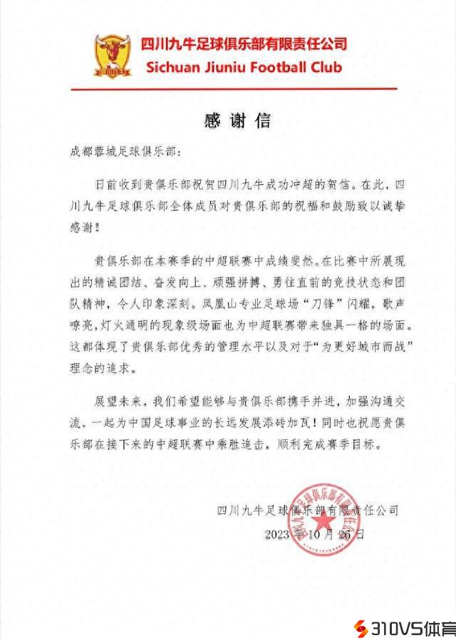 九牛回信感谢蓉城:愿携手并进,一同为中国足球开展添砖加瓦