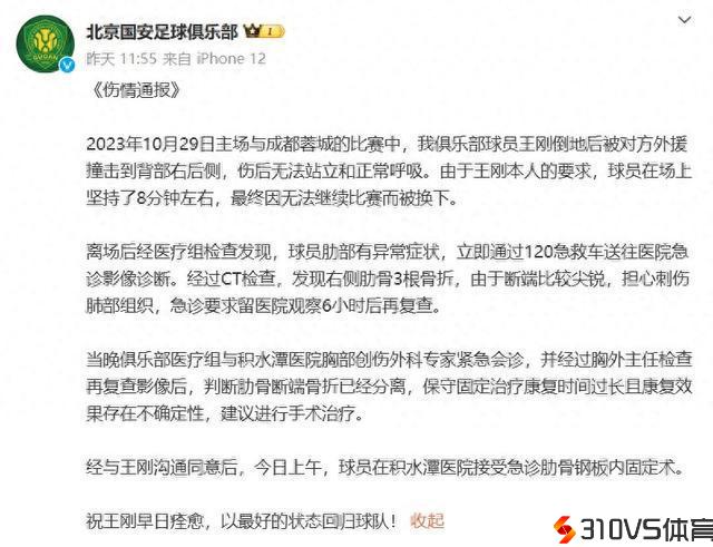 北京国安球员王刚肋骨骨折
