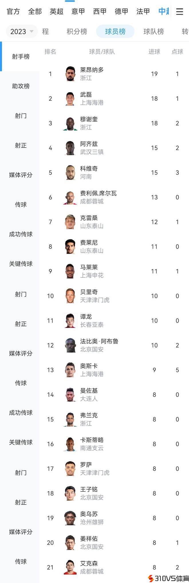 2023中超赛季完毕,射手榜状况如下