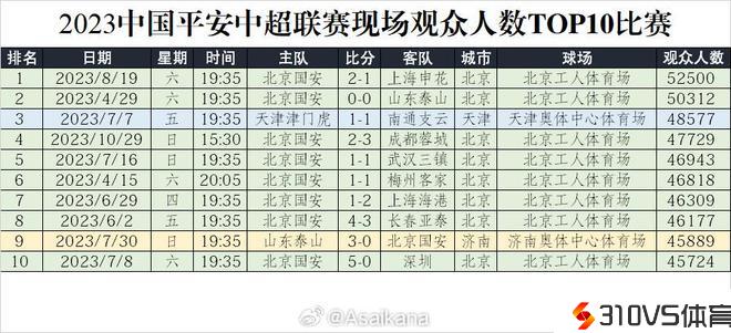 2023中超现场观众TOP10:工体京沪大战居首,国安主场占8席