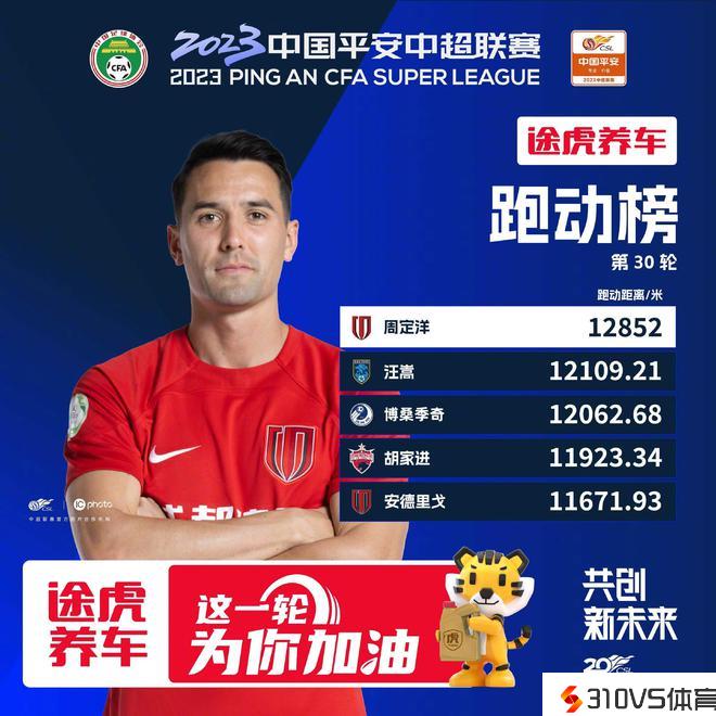 中超第30轮跑动榜:周定洋本赛季第13次登顶,40岁汪嵩第二