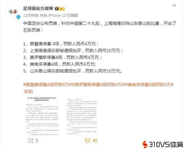 针对以下状况,中国足协开出了五张罚单:1、蔡慧康停赛 4场,罚款人民币4万元;2、上海海港俱乐部被通报批判,罚款人民币10万元;3、莫伊塞斯停赛4场,罚款人民币4万元;4、费南多停赛4场,罚款人民币4万元;5、山东泰山俱乐部被通报批判,罚款人民币10万元。