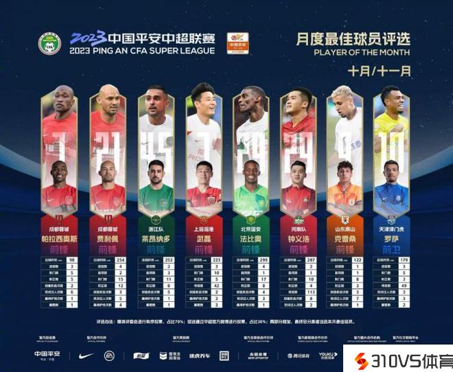 中超联赛官方发布10月/11月月度最佳球员候选,候选人是帕拉西奥斯、费利佩、莱昂纳多、武磊、法比奥、钟义浩、克雷桑以及罗萨。