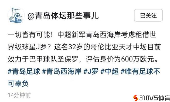 孙飞在自己的社交媒体上写道:2023赛季,25岁的哥伦比亚天赋中场拉米雷斯为青岛西海岸冲超成功作出突出贡献。下赛季,拉米雷斯的同胞、世界级球星J罗,能否加盟在社交媒体上对其关注已久的青岛西海岸?一切皆有能够!由于孙飞是青岛两支中超球队青岛海牛和青岛西海岸的跟队记者,他的话无疑具有相当高的可信度。