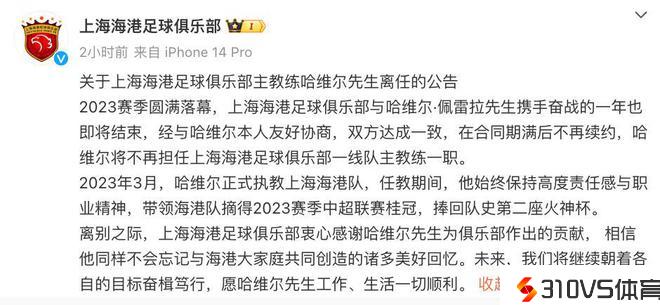 北京时间12月14日晚,上海海港发布官方公告写道:“经与哈维尔自己友好协商,双方达成分歧,在合同期满后不再续约。”