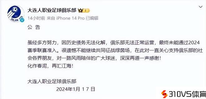 依据媒体报道,最近大连人俱乐部正式宣布解散。他们解散的缘由是历史债务无法化解,没有经过联赛准入审核所以最终只能选择坚持。随着大连人官宣解散之后,关于很多的球迷而言当然是十分忧伤的音讯。毕竟大家十分清楚,大连俱乐部这么多年以来不时是中国足球的中流砥柱,很多老球迷早已在他们身上倾注了很多的情感。无法的是随着中国足球开展变得一地鸡毛,很多老牌球队也因此遭到拖累,其中大连人由于拖欠外援和外乡球员数千万的工资,又没有大企业情愿接盘,最终只能面对解散的命运。