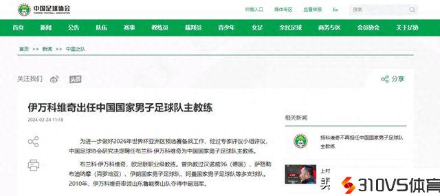 中国足协官宣:伊万科维奇出任中国男足主教练