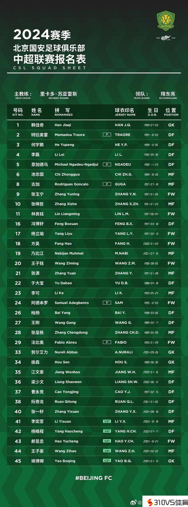 国安新赛季中超名单:姜祥佑无缘,阿德本罗24号,林良铭11号