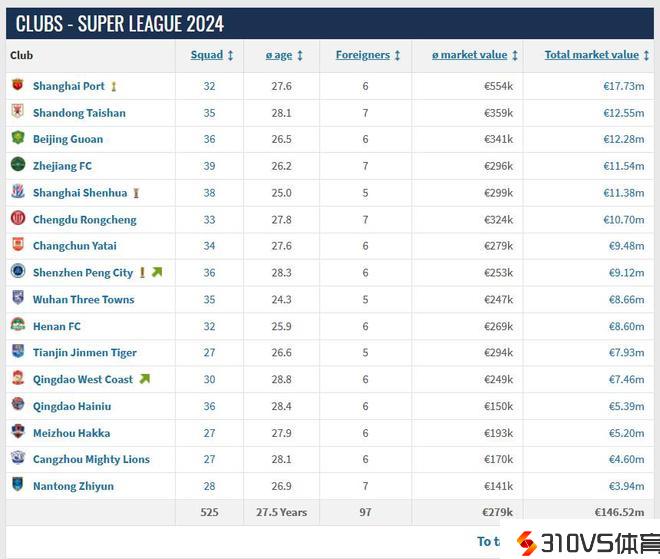 2024赛季中超球队身价榜