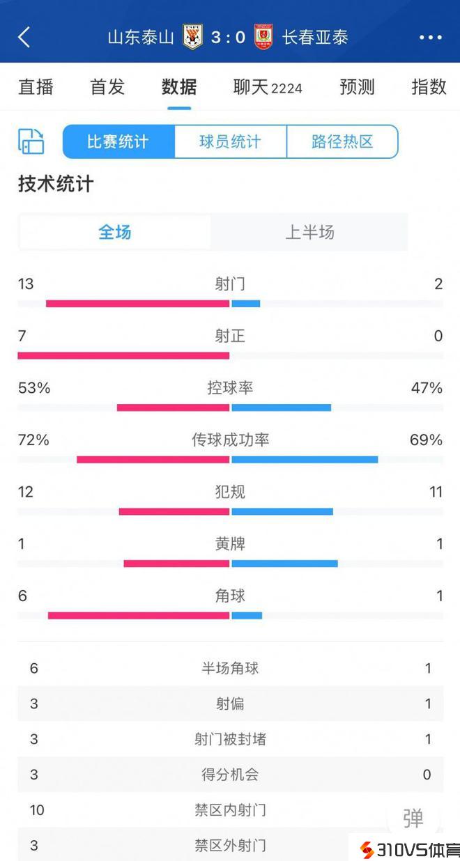 泰山半场数据:13次射门7次射正,角球6-1抢先