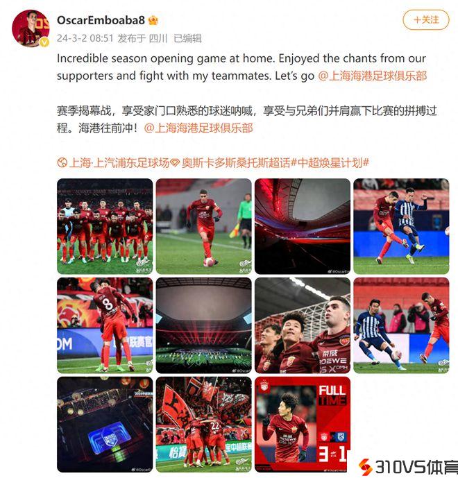 2日上午,海港外援奥斯卡在团体微博上发布多图回忆开幕战并配文: