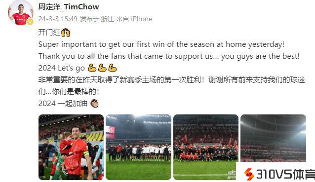 周定洋社媒:新赛季主场取得开门红十分重要,2024一同加油