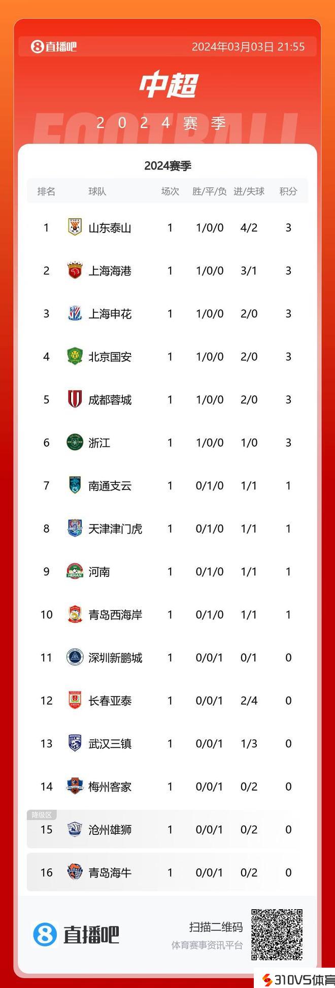 强弱清楚?中超首轮事先积分榜:泰山、海港前2,6队赢球同积3分