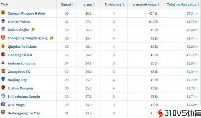 此外,对比中超联赛新赛季各球队的外援总身价排名,上海海港以1230万欧元高居榜首,而浙江队和北京国安区分以750万欧元和720万欧元位列第二和第三。这一数据展现了中超顶级球队在球员身价上的投入,同时也反映出广西平果哈嘹和云南玉昆逾越局部中超球队的身价有其清楚的意义。