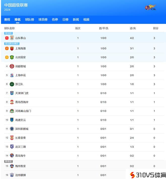 中超第1轮最新积分榜!山东泰山专心亚冠,依然火力弱小