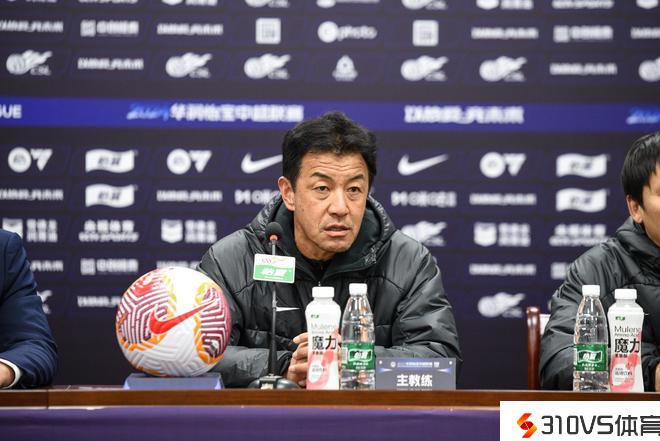 中超第二轮,青岛西海岸将客场应战上海申花。青岛西海岸主教练黑崎久志携球员陈柏良列席赛前发布会。