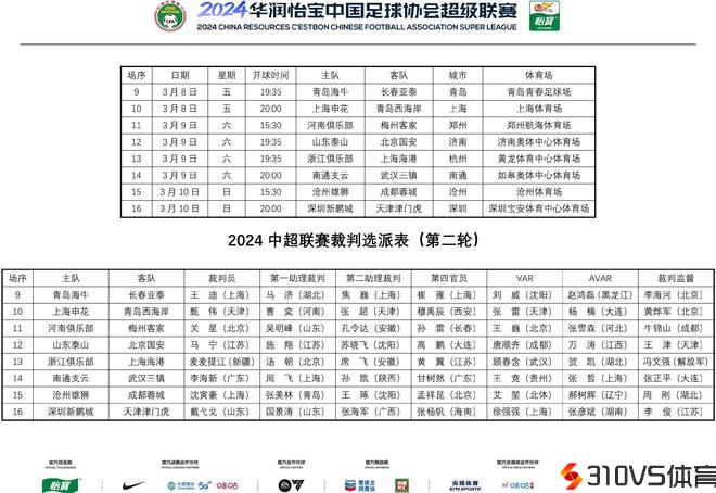 中超第2轮裁判:马宁主哨京鲁大战;麦麦提江执法浙江vs海港