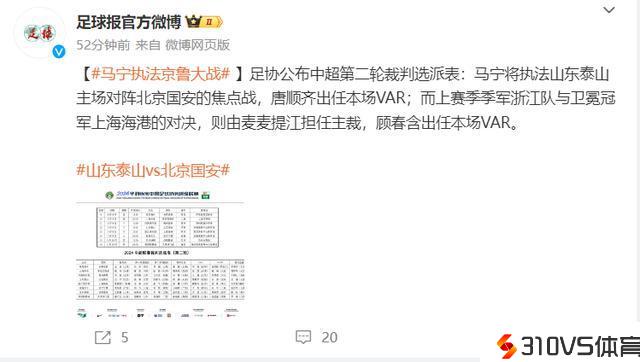 8日末尾,第二轮竞赛行将拉开帷幕,9日上午足协也正式发布了第二轮裁判选派表,令人关注的是名哨马宁将执法山东泰山主场对阵北京国安的焦点战,唐顺齐出任本场VAR;而上赛季季军浙江队与卫冕冠军上海海港的对决,则由麦麦提江担任主裁,顾春含出任本场VAR。