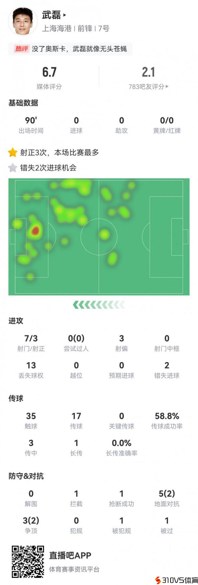 武磊本场数据:7射3正2次错失良机,14次丧失球权,评分仅6.7
