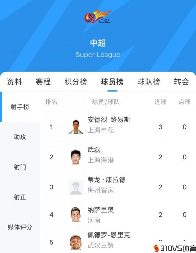 中超射手榜:安德烈-路易斯3球领跑,武磊等4人2球