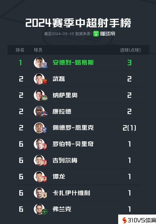 中超最新射手榜:申花外援路易斯3球居首,武磊等4人2球